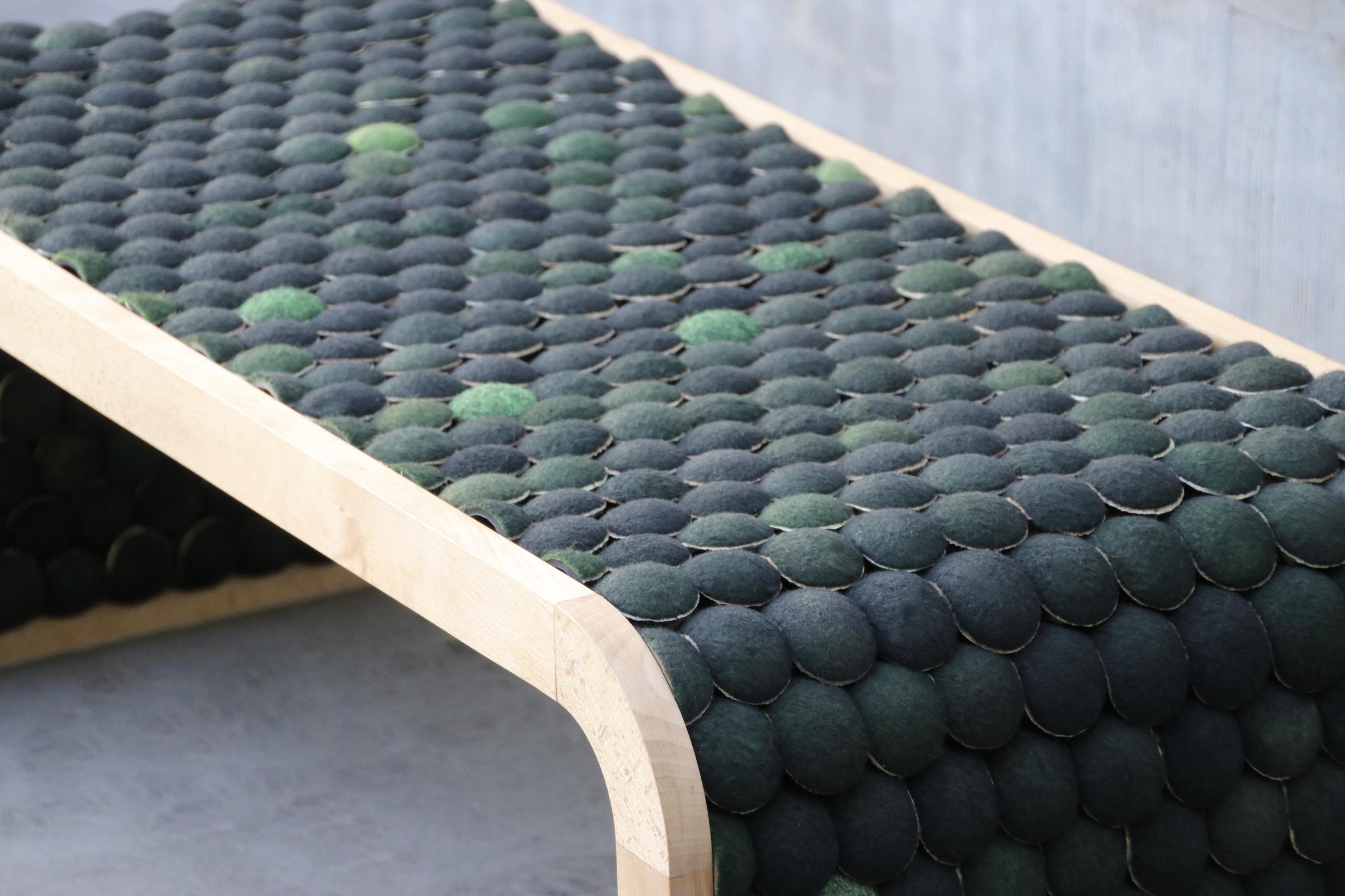 Soundbounce is an acoustic surface made from repurposed tennis balls. Each ball is manually cleaned, dyed with non-toxic pigments, and slotted into a glue-free modular structure.