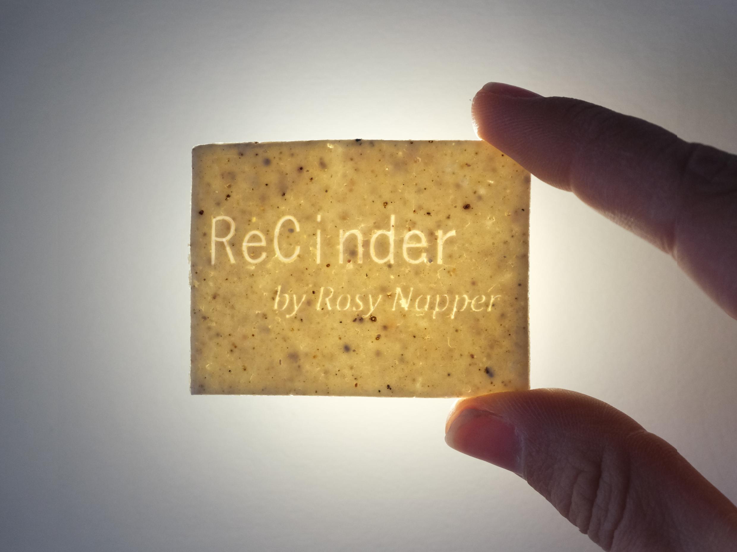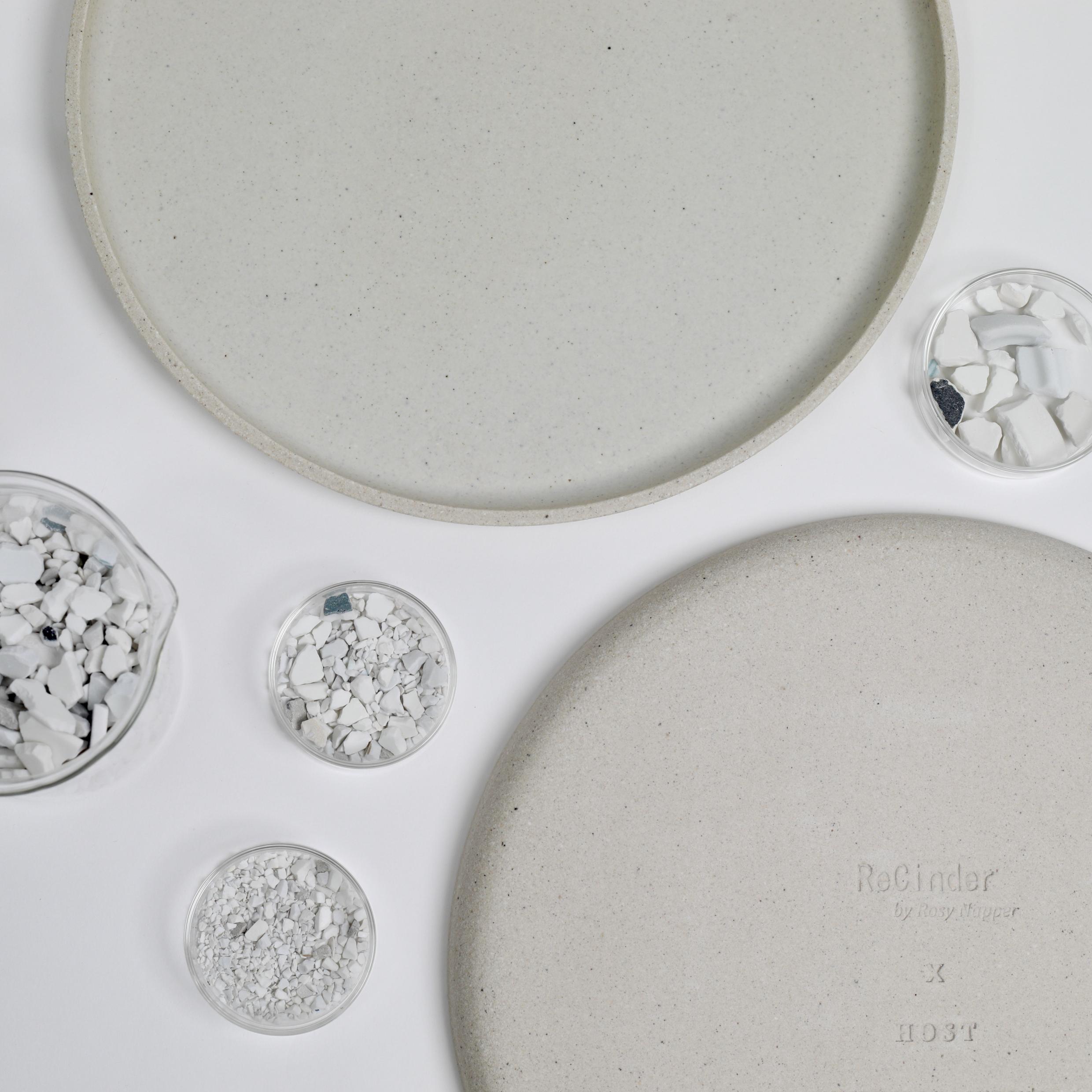 ReCinder is a 100% recycled material made from waste ceramic and ash that has been diverted from landfill. It is a greener, waste-based alternative to industrially processed clay, eradicating the need for conventionally mined and environmentally damaging raw materials often used in ceramics.