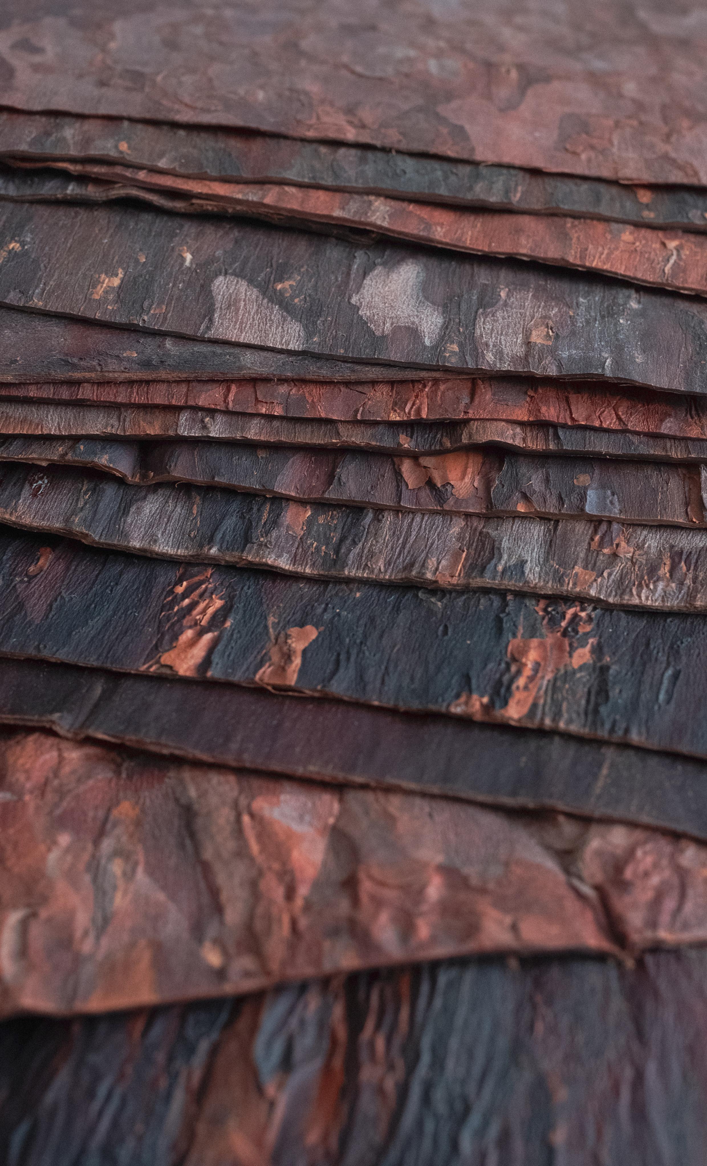 PineSkins is a versatile, leather-like material made of inner bark of pine trees, a by-product of the tree cutting industry. Ranging from earthy brown to pink, deep terracotta to ash-grey and a scent of wood, PineSkins carries a unique appearance that feels familiar yet unseen. In order to become flexible, the freshly harvested bark is treated with a bio-softening solution and enhanced with colour pigments and natural wax.